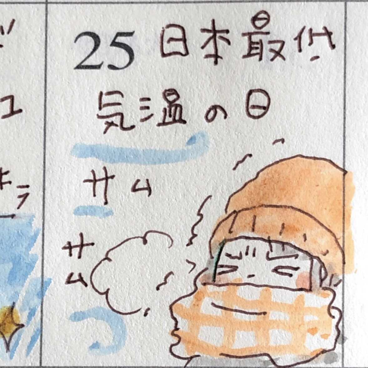 1902年(明治35年)1月25日、北海道の旭川市でマイナス41.℃を記録した。これが日本の最低気温だそう。マイナス41℃って!昨夜もかなり寒かったですが、そういう時期になるんですかね。早くあったかくなってほしいです。💦#今日は何の日 #日本最低気温の日 #イラストレーター #イラスト #手書き #手書きイラスト #手描きイラスト #シンプルイラスト #手帳 #文房具 #文房具好き #文具 #手帳好き #手帳の中身 #手帳タイム #手帳時間 #日記 #絵日記 #トラベラーズノート #トラベラーズカンパニー #日々の暮らし #サラサ #ゼブラ #マイルドライナー #スタビロ #スタビロスイングクール #pilotpen #フリクション