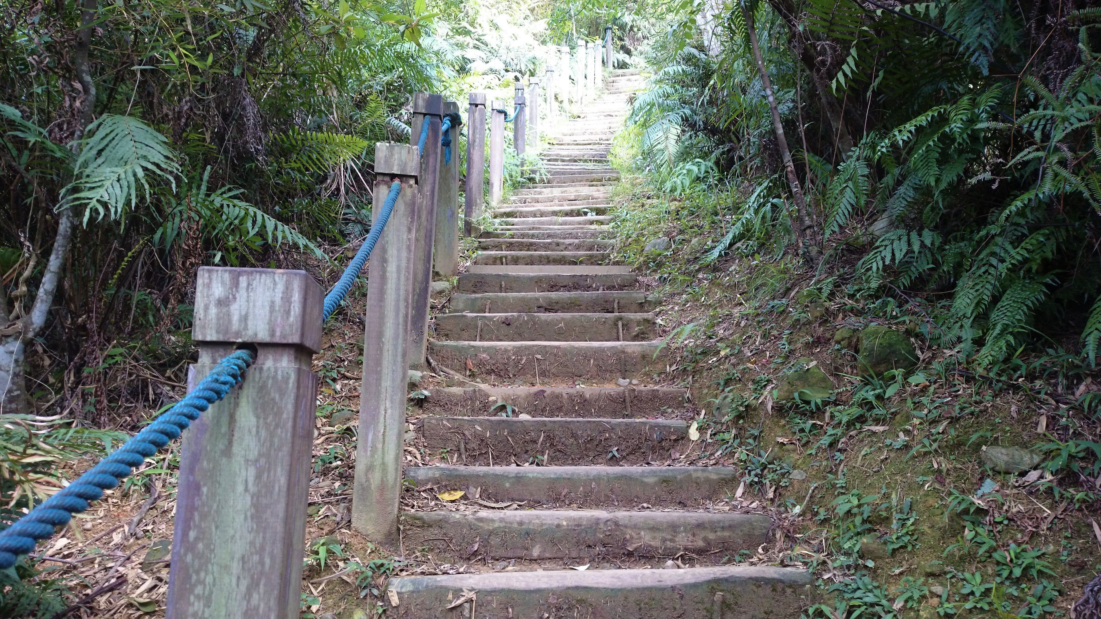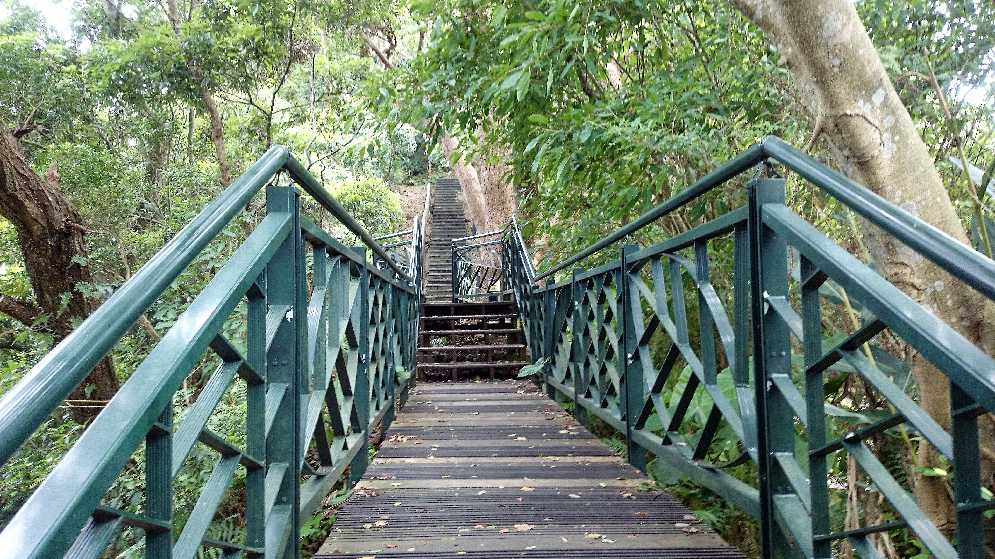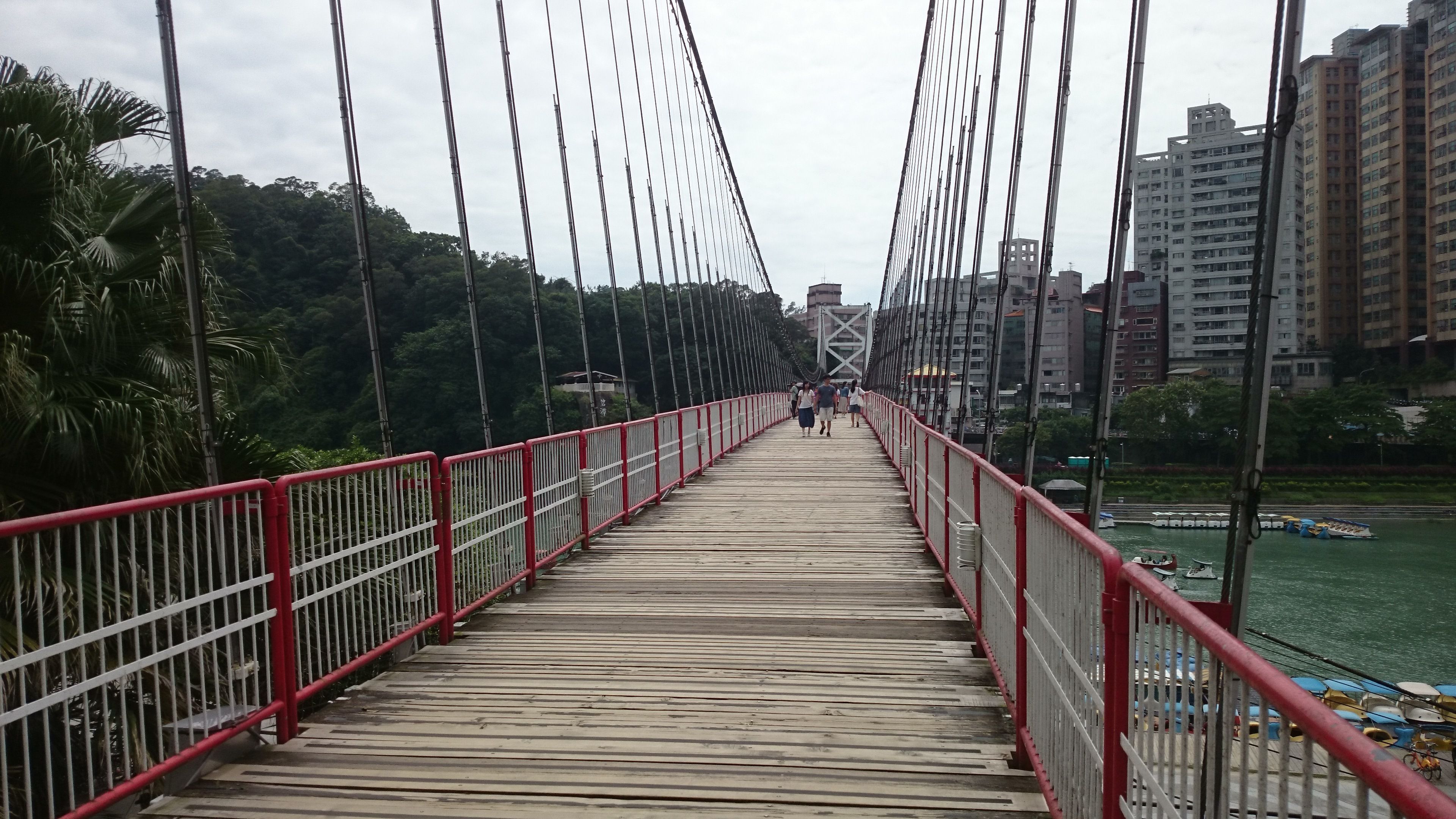 青い欄干の藍線をてくてく歩き、吊り橋の