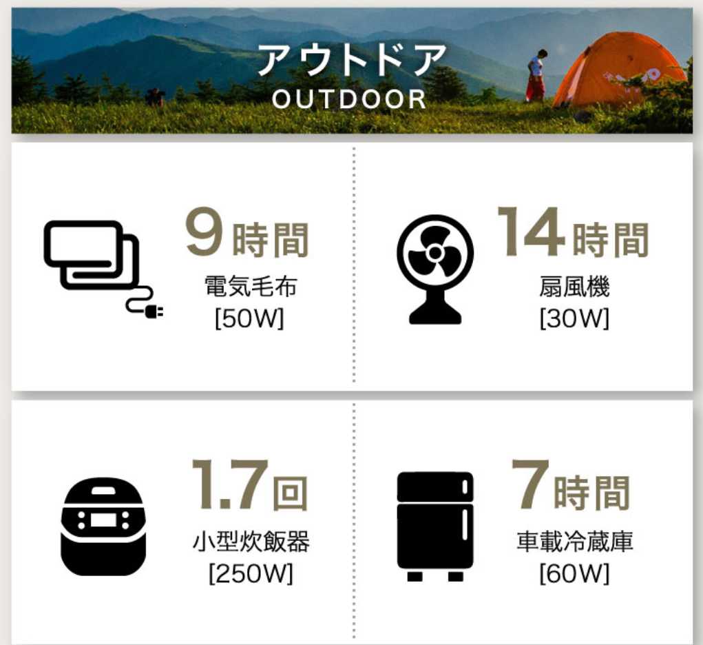 このように「家庭用の予備電源」としても「アウトドア用」としても使いやすい絶妙な容量設計になっています。