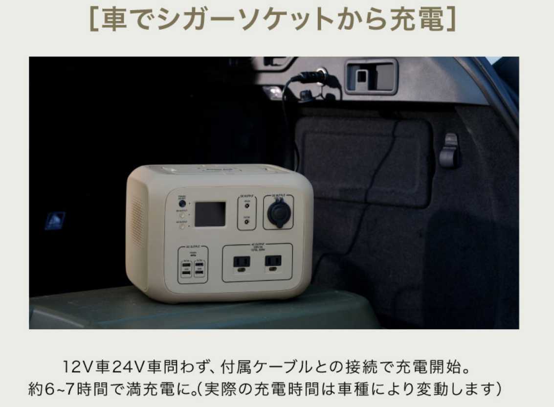 A:ACコンセントのほか、車のシガーソケットやソーラーパネル充電にも対応しています。