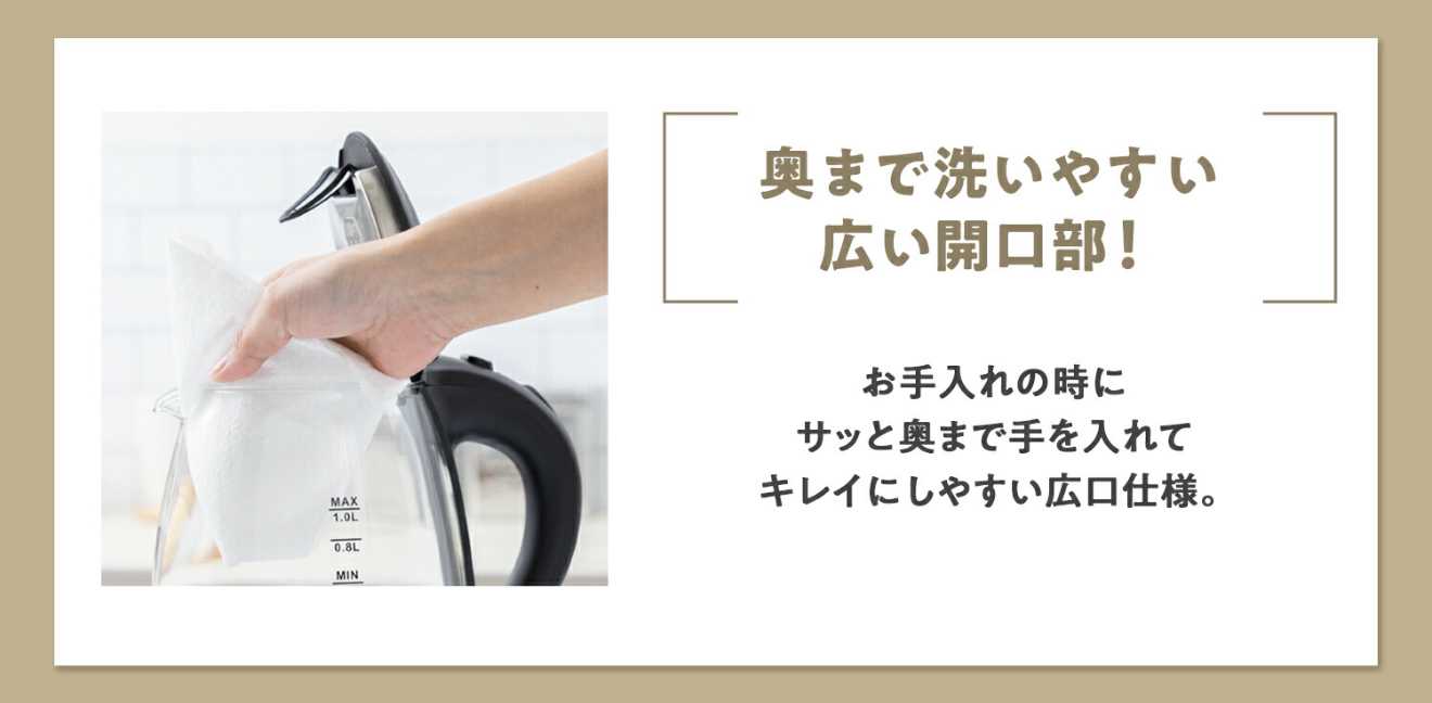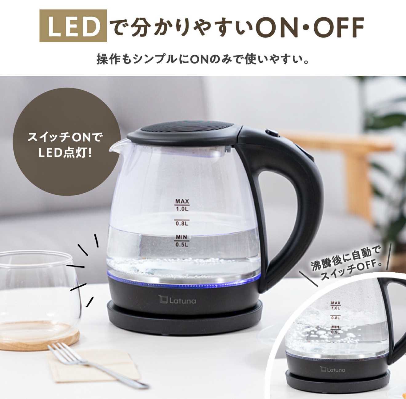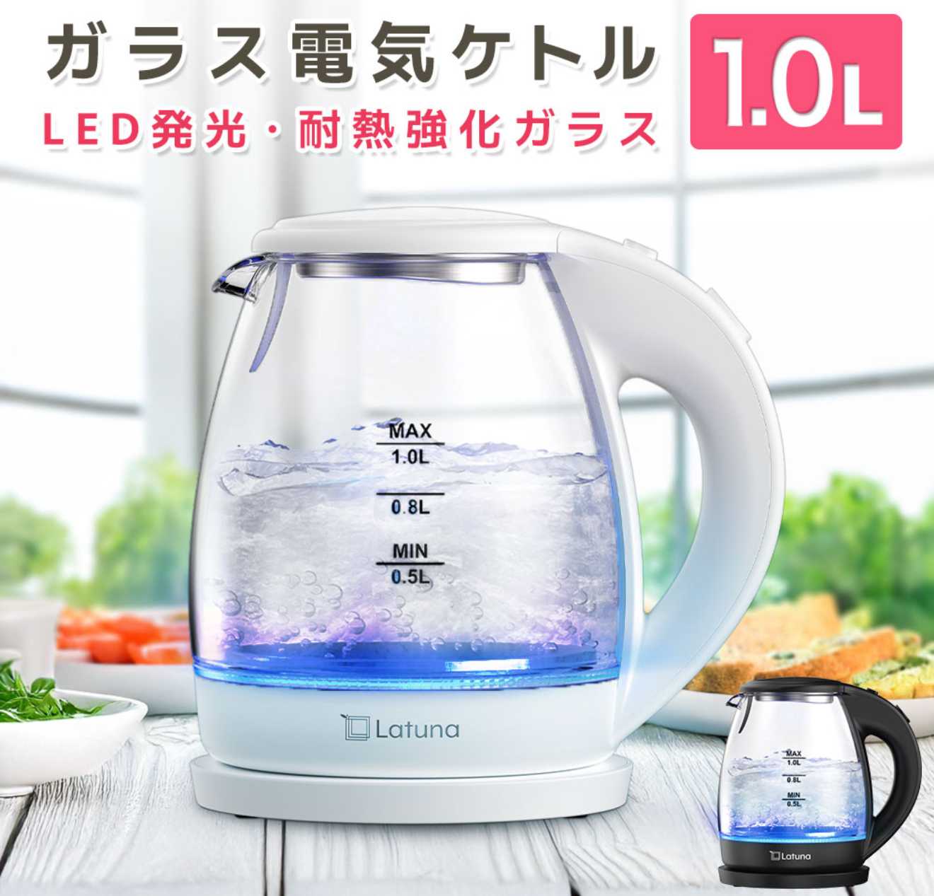 ・容量:1.0L・材質:耐熱強化ガラス+樹脂・機能:LEDライト、ワンタッチ開閉、自動電源OFF、空焚き防止