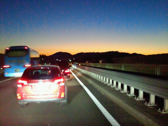 月曜日に大坂に到着する出張。今回は思い切って新幹線ではなく、車で移動してみる。できれば土曜日のうちに出発したかったのだが、豪雨のために断念。よって日曜日に出発。順調にドライビング、、と思いきや渋滞。ところがこの渋滞できれいな景色を見られた。これぞ”マジックアワー”昼と夜の境目、ほんの短時間しか訪れない夢の時間帯。CG500もこの貴重な時間をご満悦。そして、渋滞を抜けて浜名湖に到着。久しぶりだ!浜名湖サービスエリア。当然のごとく、うなぎ!!レストランに直行。ところが、、、大行列。行列に並ぶことを苦手とする私は諦めて車内へ。、、、だめだ!食べるモードの胃袋は我慢できないとグウグウ鳴る。仕方なし!車内で食事。こんな時にガスコンロが役に立つ。鍋を取り出して、ボイラーをつけておいたので熱湯をくんで、火をつける。そして、買っておいたレトルトのカレーとレトルトのご飯。しめて、、200円。100円ショップで買っておいてよかった。待つこと15分。電子レンジもあるのだが、外部電源を接続していないから、ガスの力で湯煎。おお!こりゃ立派。先日作成したコタツは運転中に暖気がたまっていて、ポカポカなので、、冷蔵庫からキンキンに冷えた緑茶で、いただきま~す!うんうん快適。今回はPCも持ち込んでいるので、行き先を確認しながら道中の算段。おやおや、、この先は横風・強風注意報!!うーん、、縦長いので横風にはめっぽう弱い。まぁ、のんびり行こう。