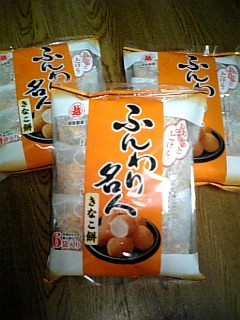 これはとても危険です。かなり中毒性が高いものです。相当の注意を払って下さい。ふんわり名人 きなこ餅うんまーーーー!!!本当に美味い!!しょせんお菓子と侮って口に入れたのですが気が付いた時には、既に1袋間食してましたwあなどれません。アナドレナイアドレナリンです。(いつぞやの文化祭w)このお菓子を見つけたら、私の口の中に放り込んで下さい。何か、もう、とりあえず試しに食べてみて下さいって感じです。私が買ったとこは6コ入りが288円でしたが、(コンビニでも別サイズのものもあるようですね。)もっと安いとこもあるみたい。箱買いしようかな・・・