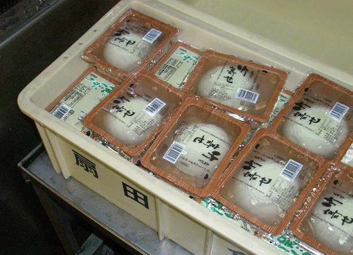 出番を待つ「竹寄せ」です。皆様から、ご注文をいただきましたおとうふは、1個1個手詰めしたのち保冷材を入れて梱包いたします。梱包担当は、佐藤君です。