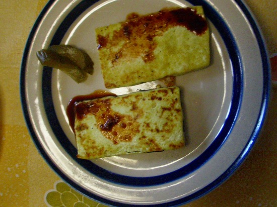 とうふdeステーキ食べて美味しいおとうふは、焼いてステーキにしても美味しくいただけます。厚さ1cm位にとうふを切ります。あとは食用油をしいて片側ずつ焦がさないように丁寧に焼けばできあがり。美味しさがとじこめられて焼き上がりとっても美味。 青ばた 絹扇華1丁 300g 840円・山形県産契約栽培青大豆使用