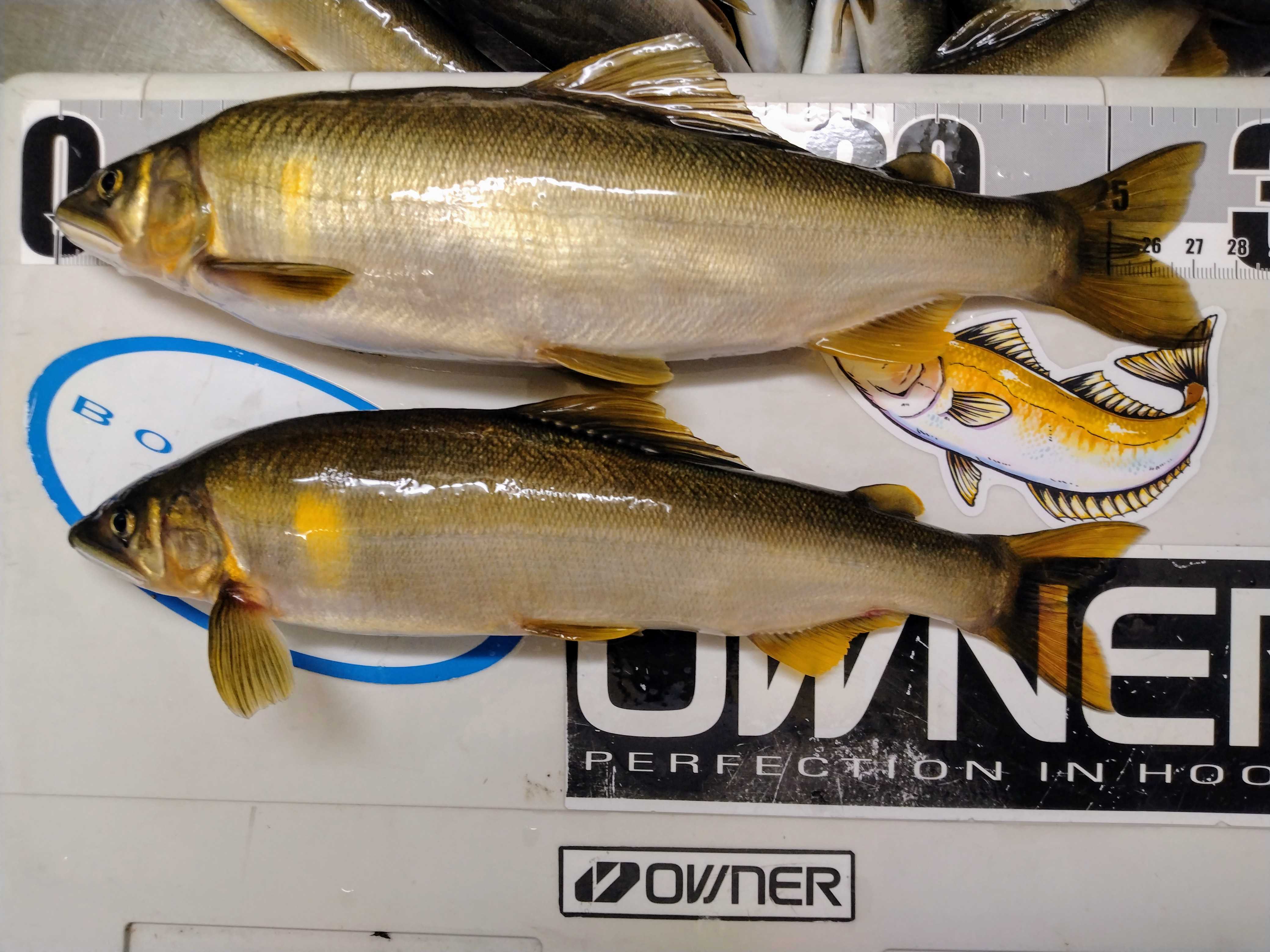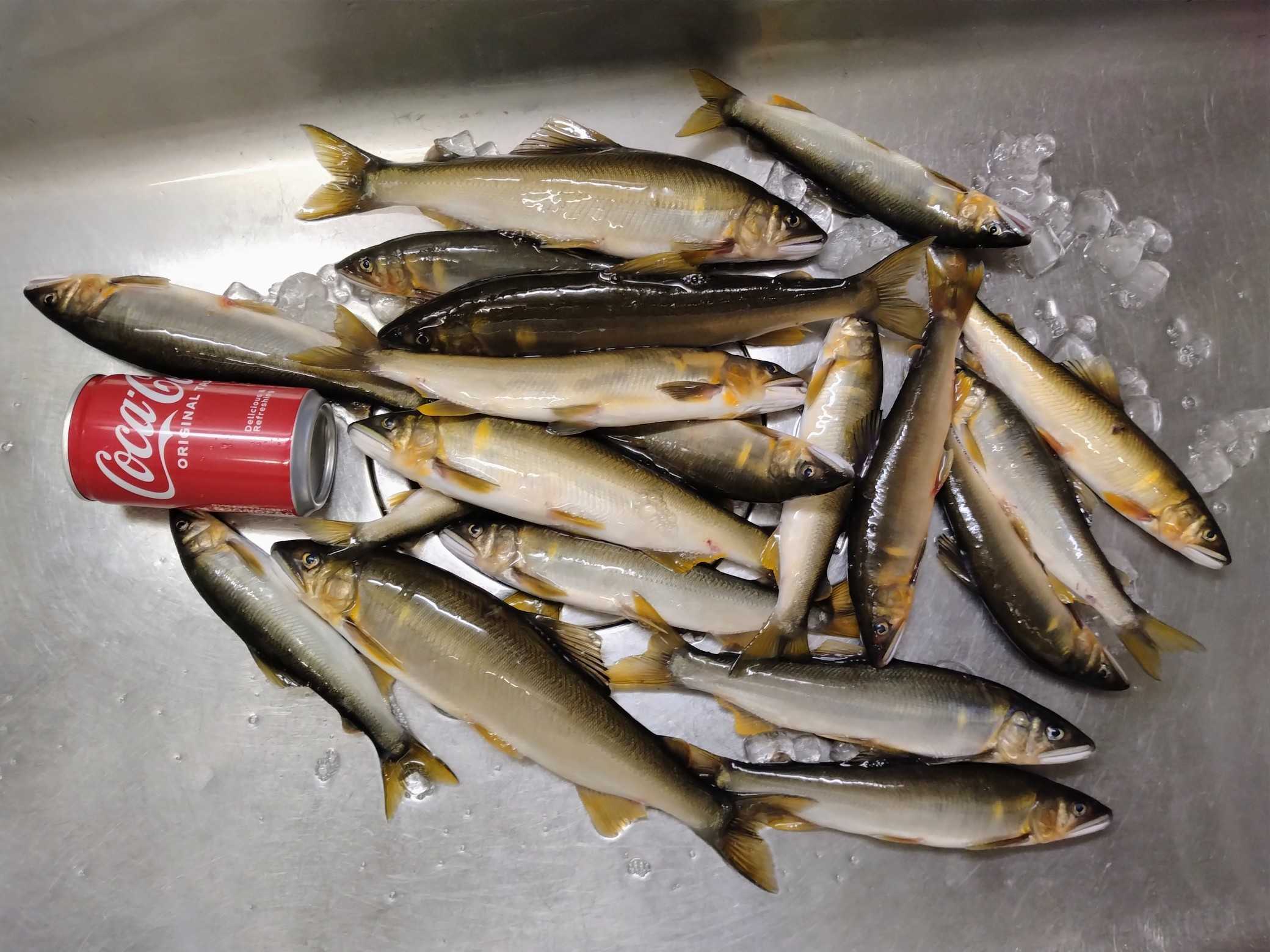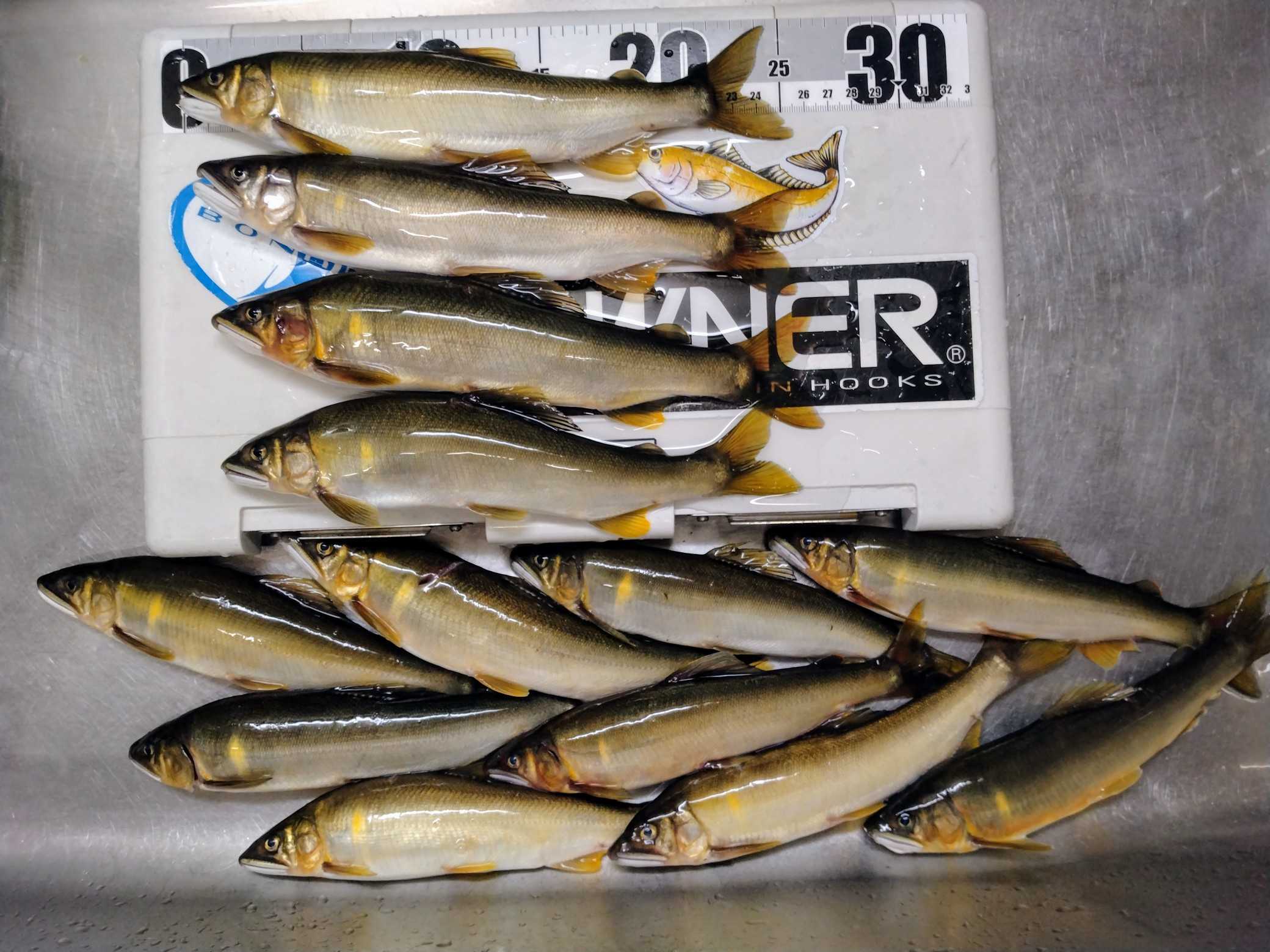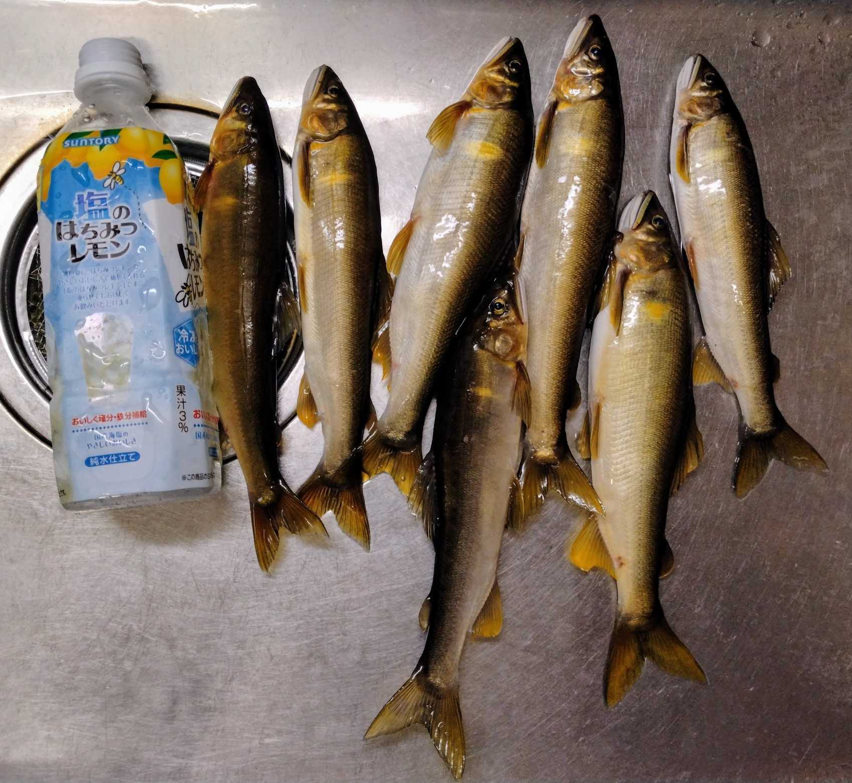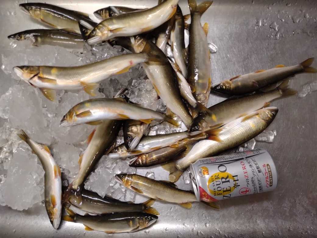<10日> 「なおちゃん」とアユへ🚙💨オトリを購入 ⇒ 「天然オトリを数尾ゲットしてから大型狙いへ」という段取りでオトリ取りPへ ⇒2か所に分かれて入川 ⇒予定通り1時間半ほどで16~22㎝を7尾キャッチε-(´∀`*)ホッ ⇒それを持って移動🚙💨 ⇒第一候補が空いていたので迷わずそこへ ⇒下の瀬は前回やってなかったからそちらの調査へ ⇒それ用の竿にチェンジ ⇒「とりあえず1~2匹」と目の前の瀬で再開 ⇒25㎝級を2尾キャッチしたので下る ⇒到着して~ ⇒予想に反して浅く、水流も弱い・・・(・。・; ⇒サーッと探ってみたが反応がない ⇒「アカン」と撤退して上に戻る ⇒3尾追加してランチタイムなのでどうするか相談 ⇒今一なので移動することに ⇒それが裏目となり2か所の調査という感じになりました💦その結果、お持ち帰りはこれだけ<12日> 今シーズン最後の🦑さんへ午後6時頃出船🚢💨沖へ向けてクルージング ⇒水深70mラインで開始 ⇒すると~1投目にこんなサイズがヒット ⇒「いいじゃん、今日は か スミ一か?」と思いながら打ち返す ⇒やはり…で午後8時前までで船全体で10尾ちょい ⇒船長が「一番沖の船が20ハイ程ゲットしているそうなので移動しましょう」と🚢💨ポッツンポッツンとヒットするが~スルメ🦑が多い ⇒途中、こんなこともスルメさんのダブルはお初かも?(;^ω^)?その結果、水揚げはこれだけでした ペットボトル氷で冷却した海水につけておいた🦑さん達は上げて30分ほどするとこんな感じにいい色に戻ってますさて、今年の🦑さんはよくいきましたが~毎回例年の半分くらいの釣果で厳しかったですまあ、来年期待で~今後はアユの禁漁日まで大型狙いで💨します