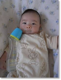 もうすぐ3ヶ月目になるケンタ.オッパイが大好きで なかなか哺乳びんで飲んでくれません…でも 私が出かけなければならない時、旦那さんがミルクをあげられるように1日に1回は 哺乳びんでミルクを飲ませています…が、飲んでも100ml程度. おまけに乳首がお口にフィットしないと ものすっごい声を出し 大泣きすることもしばしば.ケンタの泣き声は 「ん゛めぇぇぇ~~」 となんだか羊のような変な声で全身を使って必死に泣くので ついその姿に愛しくなって にやけてしまいます.でも そんなケンタが今晩は湯上りに 140mlを一気に飲みました!そして「グへェっ」と オヤジ臭いゲップをし 満足げ…今は、ベッドで これまた旦那さんにも負けない程のいびきをかいて爆睡しています.少しは哺乳びんに慣れたかな?新生児の時は全ての事が受身で なんでもすんなり行えていたのに2ヶ月目あたりから 抱き方が気に入らないと泣いたり、哺乳びんを嫌がったり、自我が生まれつつあるんでしょうか.大変だけど そんな我が子の成長がとっても嬉しく そして ほんの少しの変化でも 私にとっては大きな喜びになるのでした. Home かわいい赤ちゃんがいっぱいの 育児ブログはこちらから(byブログ村)