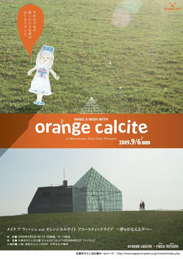 『Make a wish with orange calcite ~夢を叶える夕べ~』 『Make a wish with orange calcite ~夢を叶える夕べ~』日時:9月6日 (日)OPEN19:00 START19:15場所:札幌市モエレ沼公園ガラスのピラミット「HIDAMARI」アトリウム2料金:一般・高校生以上1000円 中学生以下 無料◎会場へのアクセス■交通機関をご利用の際は〈地下鉄→中央バス〉地下鉄東豊線「環状通東駅」より中央バス北札苗線「東69番」乗車→「モエレ沼公園東口」下車。(乗車25分、バス停より会場まで徒歩10分)■マイカーでお越しの際は「東側第一駐車場」をご利用ください(札幌中心部より車で約30分、第一駐車場より会場まで徒歩5分)※そのほかアクセス、ライブに関するお問い合わせ等については、モエレ沼公園にお問い合わせください。〒007-0011 モエレ沼公園管理事務所 TEL:011-790-1231http://www.sapporo-park.or.jp/moere/index.php いつかここで歌いたいと思っていたガラスのピラミッドでのライブ あなたの夢を片手に来てください!!