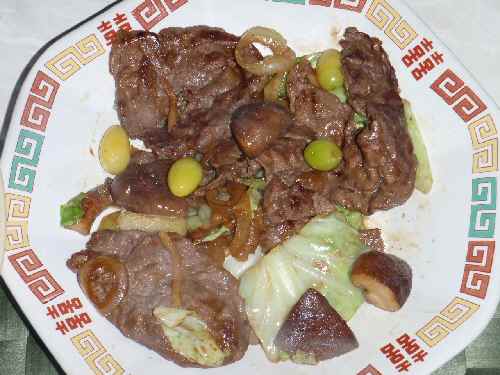 珍しく、国産牛ではなく和牛を買って来て、キャベツと一緒に炒めよう。タマネギとしいたけに、しょうが焼に買って来て余っていた生姜を細切りにして入れる。明日用に銀杏を剥いたのでいくかを飾ってみた。味付けは塩コショウとオイスターソース。こうして見ると、もう少しキャベツが多くてもよかった。少し余らせて冷蔵庫に戻したのに。ニンジンも欲しいところなんだけれど、いつも書いているように、俺が行くスーパーには1本売りのニンジンは置いていない。なんとなく中華のイメージだろうってことで(皿も中華だし)、春雨スープ。レタスにアテで残ったベビーホタテ(解凍)を乗せて、とプチトマトのサラダ。