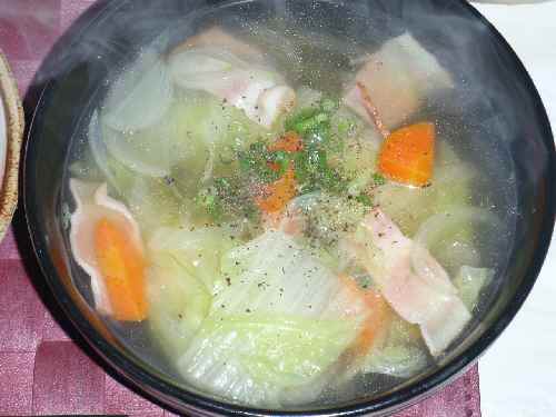 今朝、そろそろ仕事に行こうかとしていたら、大家が白菜を持ってきた。知り合いから頂いた(自家栽培の)もののおすそ分けらしい。そういうわけで、今夜は早速白菜を使う。ベーコンと白菜・タマネギ・にんじんでコンソメスープを作ろうと食材を切って、ストッカーにあるはずの固形コンソメを探したが、あいにく在庫がなかった。う~ん、しょうゆ味にするかな 味噌仕立てにするかな と5秒考えたけれど、例の俺たちの税金を470億円も溶かした某航空会社ブランドの、インスタントコンソメスープの素が目に付いたので、本来は150ccのお湯で溶くものだが、600ccの水に1袋だけ入れてみた。後は、ベーコンから出る出汁と塩コショウ。最後にブラックペッパー。600ccの分量は当然明日の分まであるので、他の食材は全て一緒に煮込んだが、白菜は今日の分だけを投入。まあ、くたくたになったらそれはそれで美味しいんだけれどね。そういうわけでタイトルは、「白菜の『コンソメ』スープ」にはならなかった。名乗るなら「白菜の『コンソメはダッチロール』スープ」かなおかずにはなぜかアジのみりん干しを買ってきたんだよね。たまーにこういうのも食いたくなる。トマトと甘~い惣菜のほうれん草の白和え。辛子明太子は一応テーブルに出したけれど、アジのみりん干しが大きすぎたので、結局食わずに冷蔵庫に戻った。