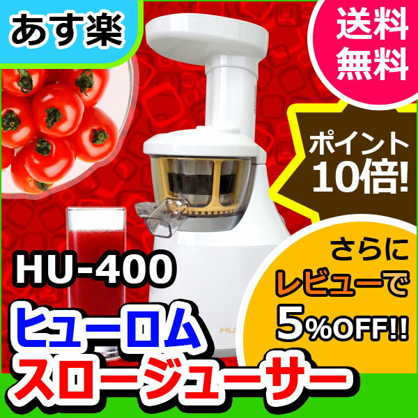 全品ポイントアップ最大10倍&税抜3000円以上送料無料★31日9:59まで!/低速/ミキサー/ブレンダー】【10】【RCP】全品ポイントアップ最大10倍&税抜3000円以上送料無料★31日9:59まで!【送料無料】人気商品♪HUROM[ヒューロム] スロージューサー HU-400 【TC】【K】【低速圧縮搾り/石臼式/低速/ミキサー/ブレンダー】【10】【RCP】栄養たっぷりのおいしいジュースができます!世界初・特許技術「低速圧縮搾り・LSTS方式」を採用!熱に弱い栄養素や酵素の破壊を抑え、栄養たっぷりのおいしいジュースができます♪■世界初低速圧縮搾りヒューロムスロージューサーHU-400の1分間に80回転の低速で搾る技術が自然のままの色、栄養素もそのままに味を楽しめます。■分離排出方式果物や野菜の繊維はジュースと別に排出されるため、消化の良いジュースが絞れます。■静かな動作!低速モーターを使用しているので、今までのような大きな音で搾る事はありません(30~50デシベル)■お手入れ簡単!水を流し込むだけの簡単洗浄が可能です。■安全設計!石臼式のため刃を使っていません。また、投入口も高く狭く改良されたため、誤ってドラム部分にまで届かない設計です。●商品サイズ(約):幅22.3×奥行16×高さ40.5cm●重量(約):6.2kg(ドラム装着時)●材質:PBT、Pアルミ(セラミック&トルマリンコート)●定格電圧:100V●定格周波数:50/60Hz●定格消費電力:150W●スクリュー回転数:70/80回/毎分●コード長さ:148cm●定格使用時間:30分以下●セット内容:本体セット(本体、固形成分受け容器、ドラムキャップ、トレー、スクリュー、 ジュースストレーナー、ストレーナー自動洗浄ホルダー、パッキン付ドラム、豆腐用型、 搾汁用受け容器、押し板、掃除ブラシ、押し棒)、取扱説明書、アイデアブックさらに詳しい情報はコチラ≫現役ナースひろみの芸能ゴシップ裏情報噂話