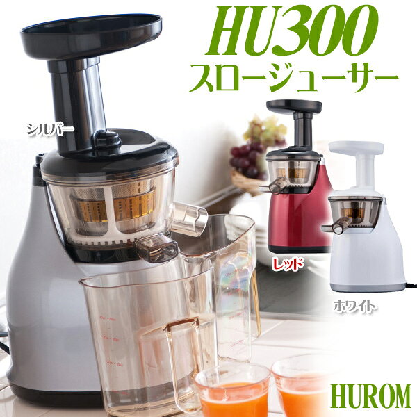 をメディアで話題の低速ジューサー スロージューサー【RCPnewlife】 送料無料☆HUROM ヒューロム スロージューサー HU-300■世界初の次世代ジューサー酵素を保持したままで果物や野菜の栄養価を壊さず美味しいジュースをメディアで話題の低速ジューサー スロージューサー【RCPnewlife】世界初の次世代ジューサー!革新的な技術で、果物や野菜の栄養価を壊さず酵素を保持したまま、美味しいジュースを搾り出します。刃を使わない石臼式の安全設計。テレビや雑誌等、メディアで話題の低速ジューサーです。g012c-18690【品番】HU-300【サイズ】(約)幅220×高395×奥行160mm (本体のみ273mm)【重量】(約)5.6kg【電源】100V 50/60Hz【消費電力】150W【定格使用時間】約30分【製造国】韓国【セット内容】本体、受け容器、ドラムキャップ&トレー、ドラム、ジュースストレーナー(小)、押し棒、スクリュー、ストレーナー自動洗浄ホルダー、豆腐用型、洗浄ブラシ(ストレーナー用)、洗浄ブラシ----- HUROM ヒューロム スロージューサー HU-300 -----◆世界初、新技術『LSTS方式(低速圧縮絞り)』搭載-----------------------------------------------1分間に80回転という低速でじわじわと搾る技術は、高速ジューサーのような摩擦や衝撃がほとんどなく、やさしく食材を圧縮してすりつぶし、その食材の持つ、酵素やビタミン、ミネラル等の栄養素を壊さず”本当の生のジュース” を作ります◆掃除の手間が軽減、『自動浄化システム』-----------------------------------------------運転と同時にジュースストレーナーのステンレス部分を常に掃除しているので、一度に大量のジュースを搾ることが可能、また、搾った後は、そのまま水を入れると水洗いができるので、ジュースの素材を変えるたびに毎回分解・洗浄する必要がなく、色々な種類のジュースを簡単に気持ちよく作ることができます全てのジュース作りが終了したら、簡単に分解・取り付けができるストレーナーを水洗いすることで長くご愛用していだけます ◆理想の栄養ジュース『ソイジュース』が作れる-----------------------------------------------ヒューロム スロージューサーがあれば、果物・野菜・大豆を一緒に低速で搾ることが可能であり、貴重な栄養素は逃しません新鮮な果物や生野菜、大豆で作るソイジュースは、果物や野菜のビタミン&ミネラルと大豆のたんぱく質や炭水化物、不飽和脂肪酸、そして酵素がプラスされた、暴飲暴食やストレスなどで疲れきった現代人には理想の栄養ジュースですさらに詳しい情報はコチラ≫無料の型紙・パターン