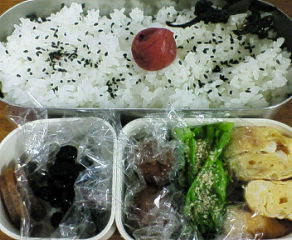 ちまちまとした事でも「イラッ」と感じる事があるんです今日のお弁当おかず容器大:玉子焼き(味海苔挟んでます) 肉団子(中華風あんかけ・・・だそうです) 容器小:ほうれん草 味噌漬けご飯をつめる段階で「梅干切れてるっ」と気がつきました。冬場なので余り心配しなくても大丈夫だろうか。。。気休めの葉唐辛子、入れてみました(名前に唐辛子が付くから・・・安易です)そして朝ごはん ハムエッグ ほうれん草胡麻和え 黒豆 わさび漬け(主人のみ) 昨日のカレーの残り かき葉の味噌汁『かき葉』って青物にありがちなアクが少なくて美味しいですよねもちろん小松菜やほうれん草なども大好きですが。