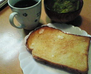こちらの方が朝食っぽい軽い昼食朝食の残り物(味噌汁)に冷凍してあったHB作成のパンそしてコーヒーまだマシな方でしょう夜はお酒を呑むので、一人の時は極々簡単に済ませます。
