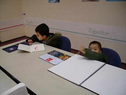 モグモグ*ちゃんから紹介してもらい、2度ほど参加させてもらった『あおぞら色彩学園』が主催する、お絵かきの様子を撮りためた写真展へ行ってきました生き生きと絵を書く子供の姿・姿・姿…思わず目をウルウルさせながら見入ってしまいました(人が居なかったら、涙ダーダーだったことでしょう)自由に、真剣に、楽しく絵を書く姿って本当に感動的ですね長男は、自分の写ってるものもあるかと楽しみにしていたようですが、残念ながらありませんでした。次回の写真展の時には飾ってもらえるように、もっともっとお絵かきに参加しようね会場の真ん中にテーブルがあり、その上には画用紙と色鉛筆やクレヨンが。主催者の方が「自由に好きなものを書いていいよ~」とお声をかけて下さいました。早速、というか待ってました!とばかりに書き始めた長男。その様子を見て、真似てみる次男 そして完成した作品ちゃん達です 『天使の羽(に見えます)』←かなり親バカはいってます(笑) 『すきなもの』(本人談) (1)虹 (2)かーちゃん (3)孫悟空だそうです。何故このチョイスなのかは分かりませんが、母の姿があって良かったです(笑)思えば私も子供の頃は時間を忘れて絵を書くことに没頭していました。子供達にもそういう時間を大切にしてもらいたいです。素晴らしい機会を教えてくださったモグモグ*ちゃんに感謝ですありがとうね~~~