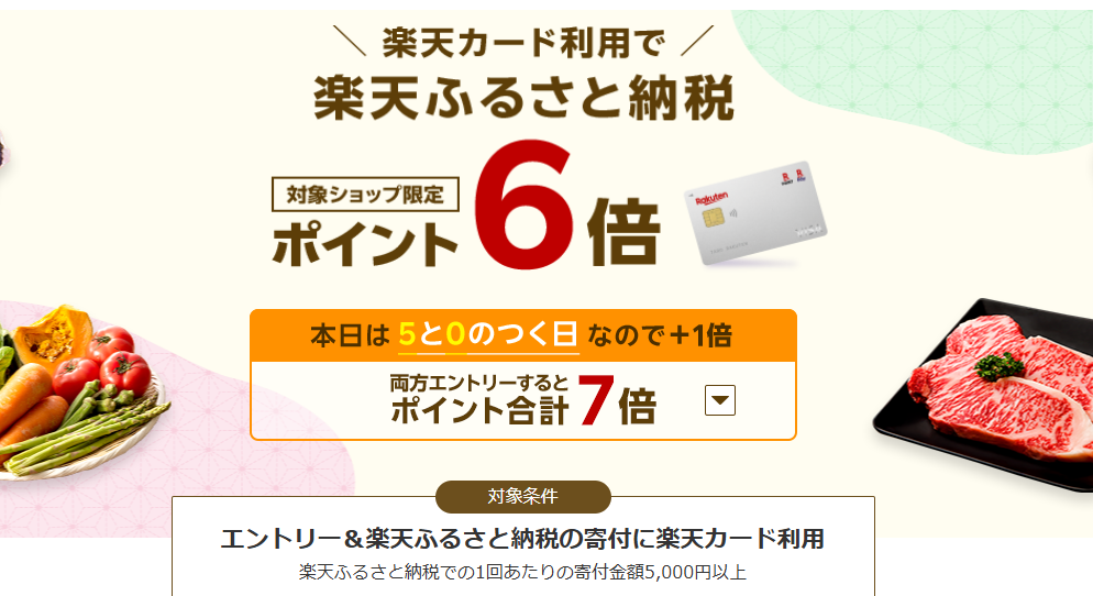 楽天ふるさと納税 エントリー&楽天カードでふるさと納税 ポイント6倍楽天カードで賢くふるさと納税!今ならエントリー&カード利用でポイント6倍のチャンス✨ふるさと納税で欲しい返礼品をお得に手に入れたいなら、楽天市場がおすすめです。エントリー&楽天カード利用でポイント6倍キャンペーン中なら、通常より多くポイントが貯まり、実質お得度がアップ。本記事では、楽天ふるさと納税のメリット、ポイント6倍の活用方法、そして人気返礼品の選び方まで詳しく解説します。楽天ふるさと納税はエントリー&楽天カード利用でポイント6倍!お得に返礼品をゲットする方法や人気商品を徹底解説。賢くポイントを貯めて、ふるさと納税をもっとお得に楽しもう。 楽天ふるさと納税の魅力自宅に居ながら全国の返礼品を選べる便利さポイント還元でさらにお得税金控除も簡単に手続き可能ポイント6倍キャンペーンとは?エントリーが必須楽天カードで支払うだけで通常ポイント+αキャンペーン期間や条件を確認人気の返礼品ジャンル食品(肉・魚・フルーツ)家電・日用品体験型・宿泊券ポイントアップを狙った選び方のコツ楽天カードを使った賢いふるさと納税のやり方エントリー手順支払い時のポイント獲得方法併用可能なクーポンやセール情報まとめ|ポイント6倍で賢くふるさと納税キャンペーン活用で最大限お得に人気返礼品もポイントで実質割引今すぐエントリー&カード利用でチャンスを掴もう