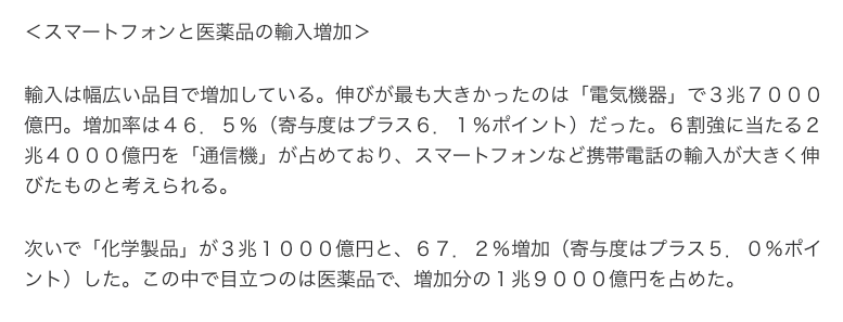 https://jp.reuters.com/article/column-forexforum-trade-tohru-sasaki-idJPKCN1PM0FT日本の貿易赤字の原因はスマートフォン、医薬品テクノロジーは難しいので、わかりやすいのは医薬品かもねえ製造じゃなくて、卸とかね