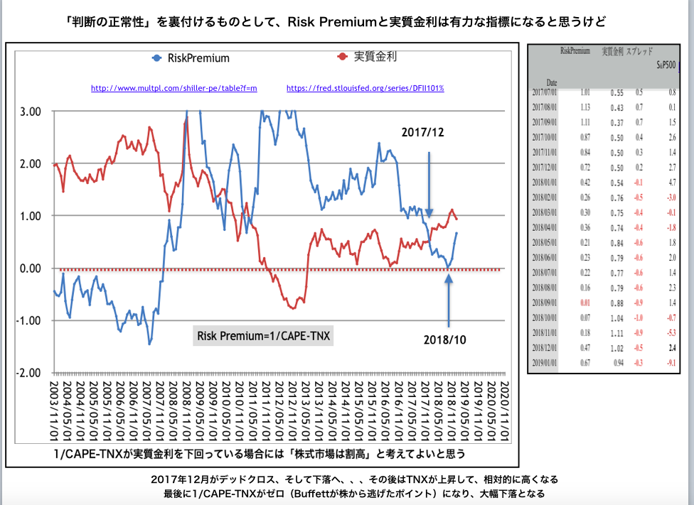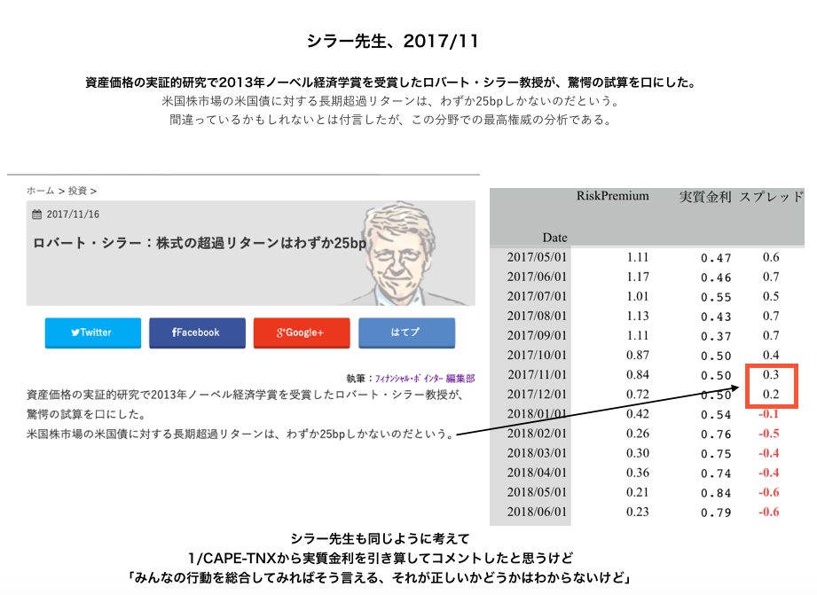 資産価格の実証的研究で2013年ノーベル経済学賞を受賞したロバート・シラー教授が、驚愕の試算を口にした2017年11月の記事です、、、、たぶん以下のように考えて、彼はコメントしているということで、本日、この記事を見つけて、自分の考えが的外れではないことがわかって安心しました、、、そしてバフェットは1965年にRisk Premiumがゼロになった時、「自分には買えるものが見つからない」とファンドをクローズして、株から逃げ出した直近でRisk Premiumがゼロは、2018年10月です、、、、