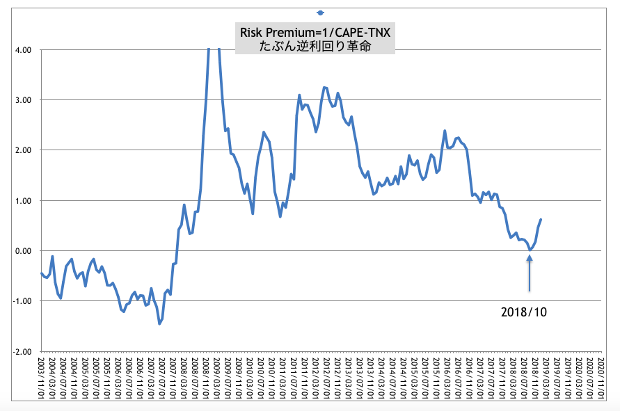 1/CAPE-TNXというのを、もう何年も前から勝手にRisk Premiumとして目安にしているんだけどたしか10月くらいに1/CAPE=4%、TNXが3.2%まで行ったよねrisk freeへ逃げますよねえもともとIQ200と言われたグレアムの考えにヒントを得て、生み出したのがシラー先生のCAPEなんだしバリュー投資家なら、これを利用しない手はないと思うんです