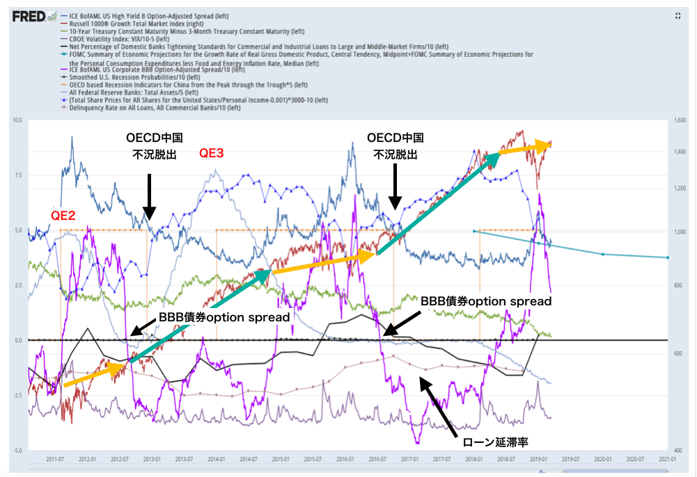 見にくい指標ですけど、これが良いかなあと思っていますBBB債券オプションスプレッドがゼロになった時にローン延滞率がマイナスであれば、、、大きく投資する米国債のイールドカーブはローン延滞率と密接な関係があるようですこの2つを合わせてみておくと良いみたい中国の不況脱出はBBB債券オプションスプレッドがゼロになって2、3ヶ月後になるのが前回、前々回のパターンでしたポジションの大きさをどうするかですがこれはTotal Share Prices/Personal Incomeで10レベルなら天井付近なので小さめ5レベルなら中間なのでそれなりに0レベルなら大きくPersonal Incomeというのは国民総収入から企業利益、税金その他諸々を差し引いた額になるようなので遅行性とはいえ、株価がどれだけ高いかを長期的には比較できると思いますhttps://fred.stlouisfed.org/graph/?graph_id=548899すごく重いチャートになっていますので、時にアクセス不能になったり、チャートが現れるまで3、4分待たされることがあります、、、参考になりましたら、、