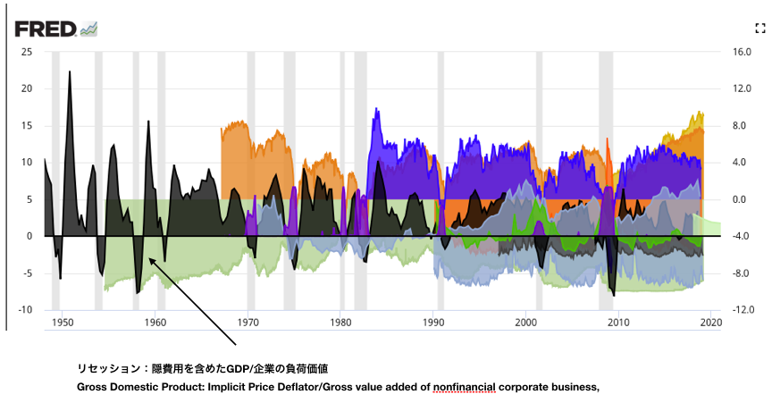 投資を始めるのに最適な時期;不況の時です不況は企業の付加価値を見ればわかります隠費用を含めたGDP/企業の負荷価値で見ると、マイナスの時期が「不況」と一致することがよくわかりますhttps://fred.stlouisfed.org/graph/?graph_id=377433#0「企業の負荷価値/隠費用を含めたGDP」の間違いです、、、雇用を除くとGDPが1.5%しかないこれが現在の好況、2007年までと全然違うそして頼みの綱の「雇用の伸び」がおそらく止まったのが、、、2019Q1?なので、2019Q1のGDPは1.5ほどだし、Q2も1.5%ほどとNY連銀は予測しているのでは?https://www.newyorkfed.org/research/policy/nowcast少なくとも失業率は上限に達していると思われますがこれが再加速するとは、、、、思えないのですけど燃料が「雇用だけ」ということなら、、、株式は雇用は大丈夫との前提で、1年半先を見て、家庭がもっと負債を増やして消費してくれると考えているんだと思いますけど、、、大前提の雇用を株式が「足元」を心配し始めたら「おしまい」ということでしょうか