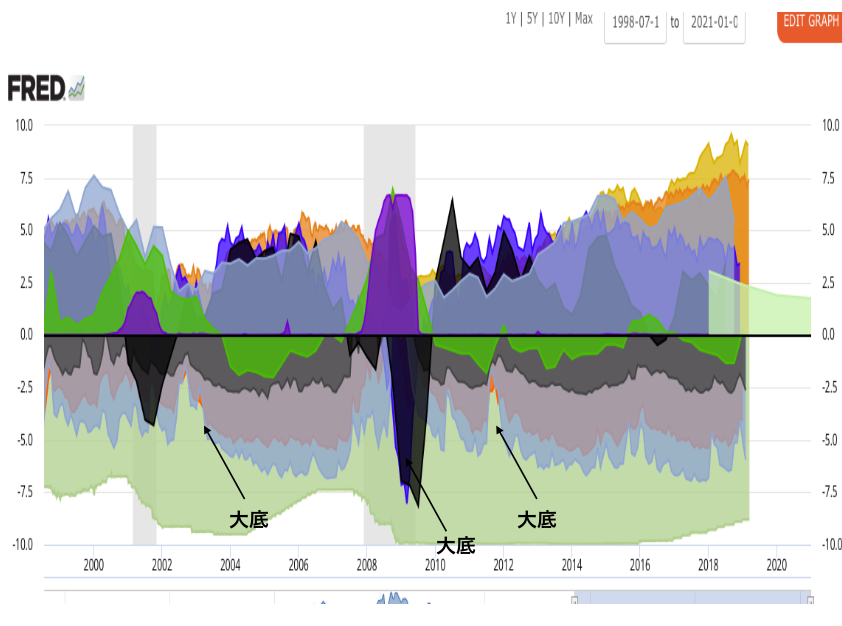 大底を知る目安としてはVIXを要素として利用しています。もう亡くなりましたがマンデルブロの理論つまり微分法方程式を捨てることで生まれたフラクタルになります(いわゆるファットテール)アインシュタインは「時間と空間」を対等に扱った天才ですが、効率的市場仮説のファーマやブラックショールズ(オプションの理論)と同じ整数次元の理論と思います。マンデルブロのVIXはノーベル賞学者の朝永先生、南部先生、ファインマン先生らの非整数次元の理論に属するもののようです、、、、(私の理解レベルでは、、、)なので大底を知るにはオプションなどの整数次元の理論だけでは不足で、非整数次元の理論のVIXを要素として加えていますVIXにICE BofAML US Corporate BBB Option-Adjusted SpreadとICE BofAML US High Yield Master II Option-Adjusted Spread、これにTED SpreadとKansas city financial stress indexを加味しています連銀のfinancial stress indexにはセントルイス、シカゴなどいくつかあるんですが、速報性に優れるものは不正確な感じで、それよりは少し遅くても正確性が高そうなカンサスシティーの数値を利用しています。補助的に企業付加価値と企業負債などをモニターしています何年に一度の大底はオレンジ色で表示されるように工夫していますがまだ改良の余地がありそうに思っています以下が私の理解となります「頭に血が上っている=物質なら自己臨界のときには整数次元の正規分布を離れて、自然界でも人間社会でも非整数次元のゆらぎ(べき乗則)が普遍的に発生する。信用不安とは非整数次元のゆらぎであり、このようなべき乗則現象は恐怖指数(VIX)を用いて判断する.。これを正規分布で考えるとショールズ,マートン両博士(LTCM)のように破綻することがある」なお、株価は1.5べき乗=1.5次元であるということが、1995の「Nature」に掲載されています。なのでオプションだけで判断すると大きく間違う局面が何年かに一回出現することでしょう。
