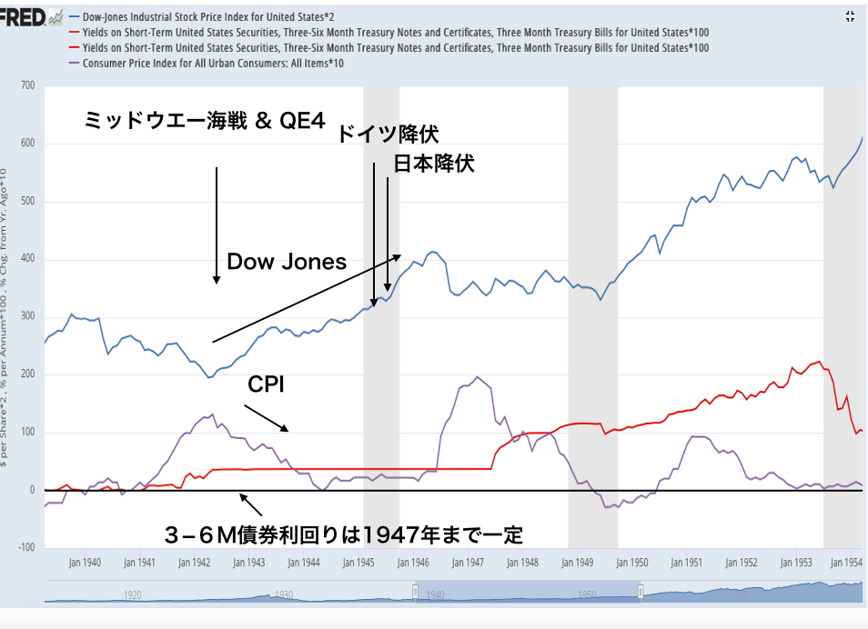バーナンキFRB元議長が退任直前に、、、、、「量的緩和の問題点は、それが現実には効果を発揮したが、理論的には効果がない」リーマンでは世界の中銀が揃ってやったから「効果があったけど」どうやったら「今後も効果がある」と、これからも信じてもらえるのだろうかそして1942年のQE4は確かに効果があり、株価は上げ続けたhttps://blogs.yahoo.co.jp/yada7215/70130635.html前回はQE4で解決がついたが、それはミッドウエー海戦を境に「日本に負けない」と米国民が自信を取り戻したからだと思うルーズベルトにあった資質が、トランプさんにもあると思っているけど1942年に失業率が増加し、これがQE4を行うきっかけとなったようだ翌年には失業率はすぐに改善し、そのまま低い失業率のまま不況となったが株価は下がらなかったhttps://www.boj.or.jp/announcements/press/koen_2017/data/ko170111a2.pdfアコード:1953年からのビルズ・オンリー政策財務省と連邦準備当局間の合意