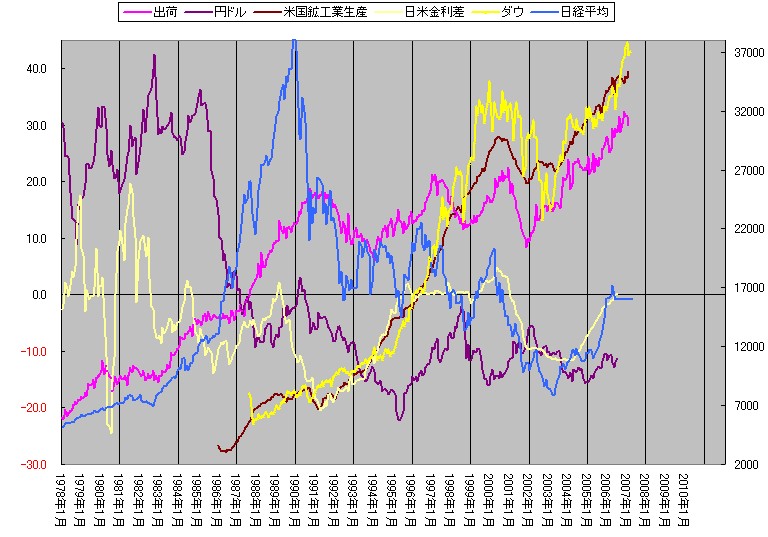 ところでチャートは日米の鉱工業生産指数と株価を重ねたものなんです。