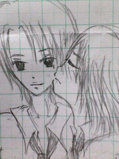 「授業を真面目に聞くことから始めています」そう、かつて僕が言った台詞だよ。悠季です。でもどうしても日本史Bの授業は眠いんです。(爆必ず、100%・・一部の記憶が飛んでます。今日は、多分初めて、担当の先生が注意したんですよ。みんなに「起きろ!!」って。僕はその時はちゃんと起きてたんで、セーフです。うん、ちょっとびっくりして、残り時間はちゃんと起きてました。何だか今日の僕は忘れ物が多かったです。SAから頼まれてた物は持ってくるの忘れてたし、今日期限のお金を封筒に入れて持ってくるの忘れるし。後者については、封筒買ってきて、所持金で間に合わせました。そう、これだけのために封筒買ったんだよ。馬鹿だよね。うん、自分でも思う。(爆そういや、以前、SAに映画に行こうって誘われたんですね。まぁ、もう行ったんじゃなくて、まだ上映もされてないんですけど。それで、観たいって言われた映画は森山さんが主題歌やってる「初雪の恋」ってやつで。確か今週からだね。上映は。けどねー、僕は正直、興味あるのは他のやつでー。まだ上映は先で、6月なんですけどね。「きみにしか聞こえない」 というやつ。切ない系の恋愛モノ。以前、小説を読むようになった時に、母から読みやすそうな小説を選んでもらって借りたんです。それは、その中にあった小説で。うん、本当切なくてね・・・・映画も是非観たいなぁ。・・・・一緒に行く人はいませんけど。今日ね、例の春抱きのOVAが来ましてね。さっき観ました。・・・・・・エロくない。(コメントが何か違うぞー!うん、わかってるよ。年齢制限もないんだもの。こうゆうものだよね。(あ、スカパーで放送された時はR-15だったみたい。)まぁ、エロさはないし、ストーリー飛び飛びだし、ちょっぴり物足りないですね。でも、心に迫るものはやはりありましたねー是非、18禁でもいいからエロく、長く、希望(笑で、今度はドラマCDを・・・どうしよう、聞こうかなぁ。こんな時間だしな・・・あぁ、つーか!例のゲームのやつ、対応遅いよ!朝入金したのに、まだ向こう確認してねーの!?セ○ンイレブンはまずかったかな・・・やっぱ、ロ○ソン・・・。平日には来そうにないな。ちぇー、土日かなぁー。僕としては、明日か明後日に来るのがベストなのにぃーーーあ、そうだ。忘れるところだった。コレ、古典の授業中に描いたやつ。横顔は超苦手です。はい、思いっきりお目汚し、BLでスイマセン。ちなみに、本当は膝くらいまで書いたし、2人の横にセリフが書いてあるのですが、あえて写さず。実を言うと、この2人は、僕が最近書き始めた、例のオリジナル小説のキャラです。(左の攻めは「蒼依(あおい)」、右の受けは「悠稀(ゆうき)」と申します。)まぁ、まだこんな関係まで進んでないんですけどね(笑・・・・すいません、ちゃんと真面目にやれよってカンジですよね。うん、今度からは、授業中にその小説書こう!(激しく待てでは!~♪「未来~風の強い午後に生まれたソネット~」森山直太朗オリコン初登場10位か・・まぁまぁだな。あ、この曲が例の、映画「初雪の恋」の主題歌です。