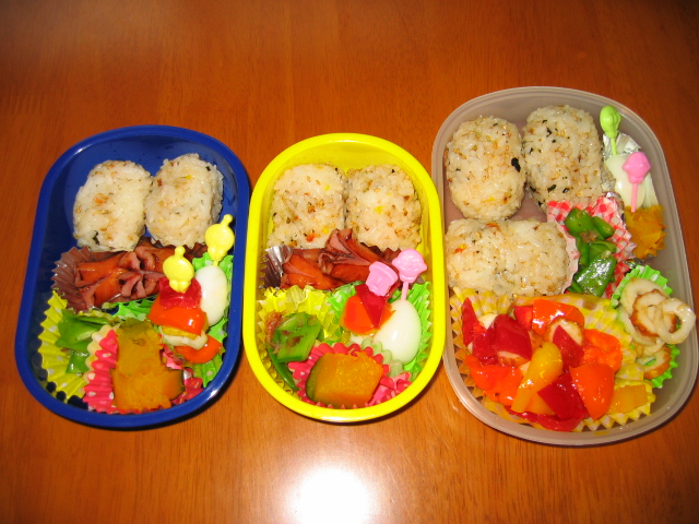 週に一回、お弁当作ってるのですが、なかなか難しい1時間位かかりました。蓋を開けて"美味しそう!"と言って欲しいので張り切っちゃいました。お料理も苦手なもので、ママ友に聞いたところ"料理の技術が無いなら、キャラクターもののバランとかピックとか使っちゃえば良いの(^O^)"と言われ、さっそく買いに行きました^_^;実際使ってみると、それも良かったらしく、大喜びで食べてました。完食です本とかも買ったので、それも参考に・・(^O^)本日のメニューは◎ふりかけ入りおにぎり、▲に切った海苔のせ◎かにカマの薄焼き卵巻き◎鶉の茹で玉子と茹で人参のピック刺し(アンパンマンのピック)◎ブロッコリーのドレッシング和えこんなもんです。写真撮り損ねたというか、載せれるほどではないので自信がついてきてから、載せたいと思います(^O^)