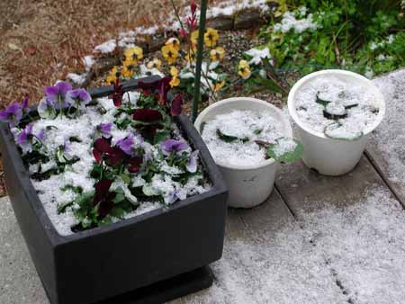 それも今は溶けてない。写真の植物は、ビオラ、リュウキンカ(白ポット)、ハクチョウソウ(棒で支えられている赤い花)、イタリアンパセリ(右隅の緑)。