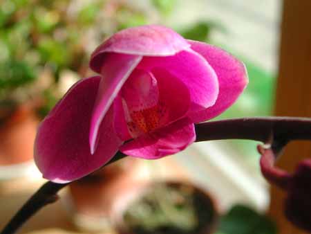 写真の一輪は例年に比べれば早い。このコチョウランは去年の9月に頂いたもので、そのとき満開に仕上がっていた。新たな水苔で植えたあと、花茎の途中から新しい花茎が・・急きょ「体内時計」を合わせた印象ですね。