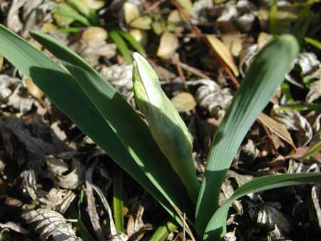振り返って、うちのニホンスイセンは、まだ蕾が「袋」をかぶっている。この袋が寒さから蕾を守っているのか。
