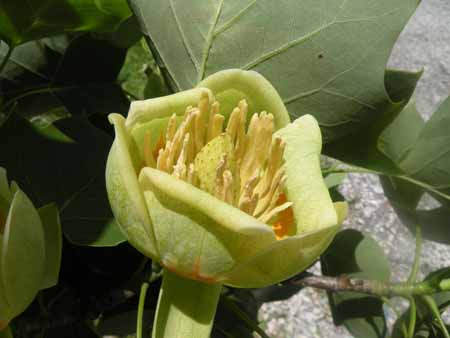写真は、ユリノキの花。色が地味なだけに誰も気がつかない。十メートルを超える高木が3,4本も並んでいた。
