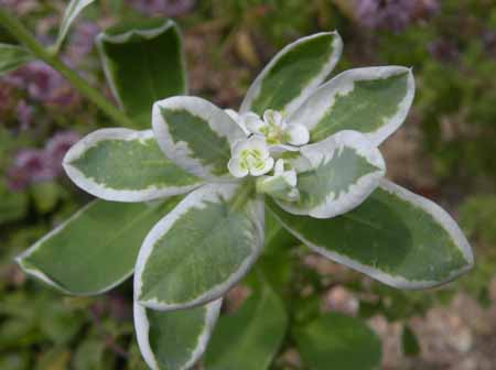 いっぽう、落ちこぼれた種からハツユキソウが庭のあちこちに。こちらは数センチの高さになってから、それと判った。