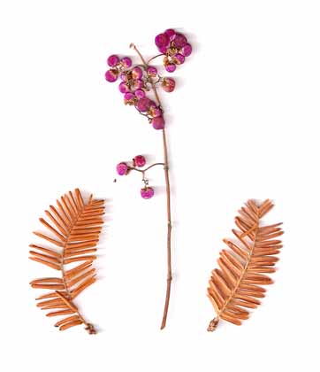 今日はコムラサキの果実とメタセコイアの落ち葉の組み合わせ。ただし組み合わせに意味があるわけではない。
