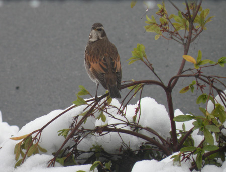 先だっての ジョウビタキ よりは遠いが、数メートルあたりでこちらを窺う。写真は室内から撮ったもの。ツグミだろうか。撮るときは、あちらに向いていると思ったけれど、パソコンで拡大してみると、ちゃんとこちらを窺っていた。