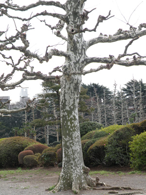 花がないから人気のない庭園の片隅では、プラタナスを背景に、細くて長い脚を露出した、美脚の女性が男二人に付き添われて写真撮影中。気のせいか、モデルさんがチラチラ見たようだが、残念ながらお顔に心当たりがなかった。