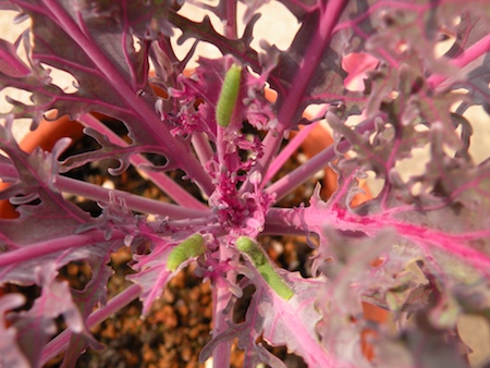 前に書いた軽口では、切れ葉タイプのハボタンなら、モンシロチョウの幼虫に葉を食べられても、人目には区別がつかないだろうから許してあげるだった。しかし、ある時ふと、ハボタン「くじゃく」に近づいて目をこらすと、青虫がいっぱい張り付いているではないか!