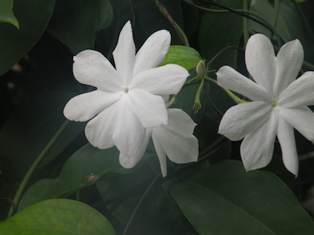 ヤスミヌム・レクス(ソケイ属)はモクセイ科で、ジャズミンティーの香り付けに使われるマツリカの仲間だそうだが、レクスはさっぱりにおわないので期待はずれのよう。