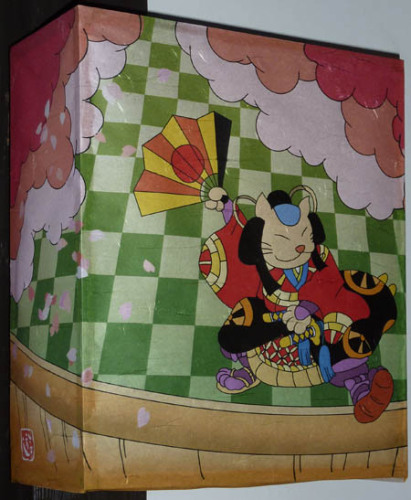 梅でさえ三週間遅れていると言われる開花ですが、工房の行灯は早桜の季節を早取りしました。遊にゃんの義経千本桜です。言うまでもなく奈良の吉野に身を潜め、頼朝に追われる義経なんですが、歌舞伎や能ではその周辺の人物や人物に化けた狐が主人公となります。この行灯は勇壮な義経の武者姿を吉野の桜を背景に描いたものです。これは昼の行灯。上は夜になって明かりを灯した行灯です。大寒気から一転春の陽気になったこの頃遅れていた梅も咲き始めました。この分だと遅れる筈の桜も思ったより早めに咲くかも知れません。