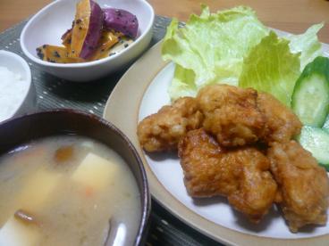 今日の夕飯は旦那さんのリクエストで鶏の唐揚げにしてみました鶏の唐揚げかんたん大学芋なめこと豆腐と根菜の味噌汁大学芋はさつまいもが冷蔵庫に眠ってたのでそろそろ使わないとやばいなぁと思って作りました。だから今日はお米は食べるの止めようと作ってるときは思ってたんだけど実際、唐揚げを目の前にしたら誘惑に負けましたいやぁ~~、鶏の唐揚げ!久しぶりに食べました。坊ちゃんにも好評で小さいのを3個用意してあげたのにわたしの分まで食べました。食べましたっていうか横から取られた~~味噌汁もお芋さんもわたしの分からちょっとづつ取っていくし絶対食べすぎだろうよってくらい食べてます。いいんだか。。。 design by sa-ku-ra*