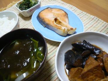 今日は同じ町内のお友達のおうちへ夕方まで遊びに行ってたので夕飯作りを手抜きしてしまいました帰ったら6時になっててちょっとびっくり。今日は和食なので色味がない感じです。何か全体的に黒いです画像UPしてないときはたいていこんな感じの変わり栄えのない食事なのでいつも写真撮らないんですけど、たまにはね。焼き鮭厚揚げとナスの味噌煮ブロッコリーの胡麻和えとろろこんぶ入りおすましあとお友達からいただいたシュークリームとパイのお土産もいただきましたシュークリームってハードタイプが好きなのですごい嬉しかったですごちそうさまでした design by sa-ku-ra*