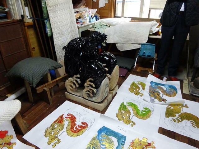 神奈川県藤沢市で小田急電鉄 片瀬江ノ島駅の建て替え工事が進んでいます。その正面には竜宮門を造り、軒には唐破風をあしらいます。菖蒲桁(しょうぶげた)を支える持ち送りは龍のデザインです。彫刻家の井上進一さんが龍を彫り出し、塗師(ぬし)屋に漆を塗ってもらいました。写真の中の真っ黒な物体が漆を塗った一対の龍です。「本当に細部まで、丁寧に塗ってありますね」「いつも感心します。でも、逆にこのくらいでないと金箔がうまく押せないんです」この龍は金箔と彩色で仕上げます。小田急電鉄の担当者が工房まで足を運んでくださったので・・・「金箔だけでは映えないので、彩色を施そうと思いますが・・・どんな感じがいいですか?」塗り絵を何枚も用意し、お見せしました。「そんなこと言われても・・・迷うなあ」【菅野企画設計】は、寺院建築・和風住宅・古民家再生を得意とする設計事務所です。≫≫ 菅野企画設計 HP≫≫ 寺院完成ギャラリー≫≫ Instagram(寺院)≫≫ Instagram(住宅)≫≫ Pinterest◆本社◆ 愛知県一宮市木曽川町黒田往還南60-3 TEL 0586-84-2003◇関東事務所◇ 横浜市中区太田町6-79アブソルート横濱馬車道ビル4階 TEL 045-264-9160