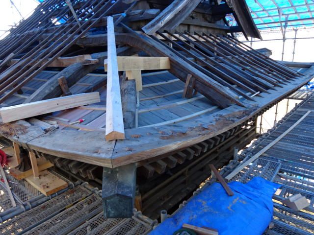 愛知県岡崎市の本光寺で、国の登録有形文化財に指定されている楼門を耐震改修しています。工事は、競争見積もりの結果、愛知県江南市の(株)アイチケンにお願いしています。この楼門は1827年の建立です。現在、屋根瓦と野地板が除去され、小屋組みが露わになっています。写真をご覧ください。新調した隅木とその下の野隅木の方向が微妙にずれていることがわかります。振り棟という技法で、妻壁を少し大きく見せる工夫です。次に隅木の右に目線を移すと・・・軒を支えている丸太が見えます。その丸太を左にたどると・・・くの字を描いて向こうに続いています。きっと、この屋根にぴったりの丸太を探して、加工したんでしょうね。そして、丸太が曲がったところに桔木の丸太が潜り込んでいます。構造的にはあまり感心しませんが・・・面白い仕事です。当時の大工の工夫を生かしながら、耐震改修!設計士としても面白い仕事です。【菅野企画設計】は、寺院建築・和風住宅・古民家再生を得意とする設計事務所です。≫≫ 菅野企画設計 HP≫≫ 寺院完成ギャラリー≫≫ Instagram(寺院)≫≫ Instagram(住宅)≫≫ Pinterest◆本社◆ 愛知県一宮市木曽川町黒田往還南60-3 TEL 0586-84-2003◇関東事務所◇ 横浜市中区太田町6-79アブソルート横濱馬車道ビル4階 TEL 045-264-9160