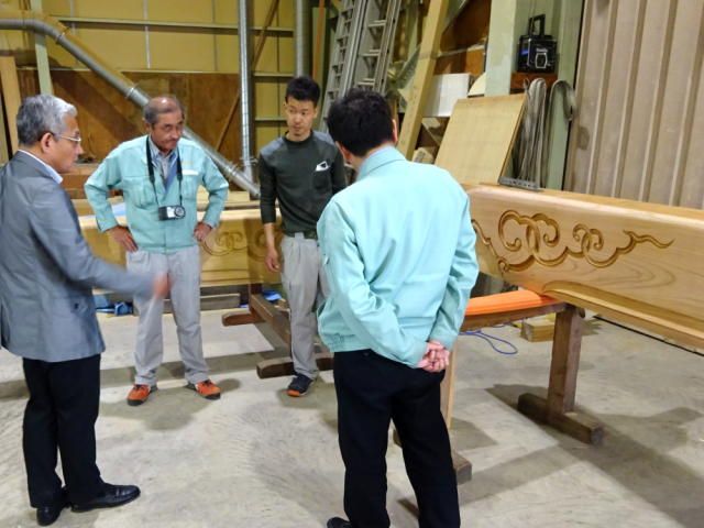 名古屋市の浄土宗西山禅林寺派 東宝寺の本堂を造ります。工事は、競争見積もりの結果、石川県能美市に本社を構える松浦建設(株)にお願いしています。伊藤を同行し、木材加工の検査に本社工場を訪ねました。本堂は間口7間の木造で、伝統的な入母屋造りの瓦葺き、床面積は約310㎡(94坪)です。堂内は直径36cmのケヤキの丸柱、彫刻付きのケヤキ虹梁、蟇股と豪壮なしつらえになります。先ず、加工を始める前に私が工場を訪ね、屋根の形や軒ぞりを確認修正しました。その後、仕口や継ぎ手について、大工や現場監督とは施工図でやり取りをし・・・加工の様子を写真で、伊藤が工場を訪ね目視でチェックを重ねてきました。そして、その最終確認です。加工はほぼ完了しており、彫刻も思い通りに仕上がっていました。また、私たちの質問に対しても棟梁や監督から打てば響くように答えが返ってきて、とても充実した検査になりました。将来が危ぶまれるほど、職人が激減してきた今・・・素晴らしい造り手に恵まれていることを、こころからうれしく思いました。【菅野企画設計】は、寺院建築・和風住宅・古民家再生を得意とする設計事務所です。≫≫ 菅野企画設計 HP≫≫ 寺院完成ギャラリー≫≫ Instagram(寺院)≫≫ Instagram(住宅)≫≫ Pinterest◆本社◆ 愛知県一宮市木曽川町黒田往還南60-3 TEL 0586-84-2003◇関東事務所◇ 横浜市中区太田町6-79アブソルート横濱馬車道ビル4階 TEL 045-264-9160