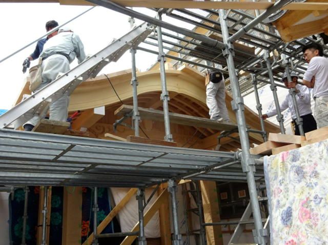 岡崎市の真宗大谷派 専福寺の客殿・庫裡を造っています。工事は地元の山崎建設(株)にお願いしています。木造2階建てで、床面積は約569㎡です。現場では、玄関の唐破風屋根の工事が始まりました。建て方が終わり、3人の宮大工が屋根の軒先を施工しています。「棟梁!破風の拝みの曲線が自然じゃないよ。天端を削ってくれないか」「わかりました」建物の配置の関係で、唐破風屋根の軒が充分出せなかったので・・・出来栄えに不安を抱いていたのですが、いい感じに出来上がっています。今回は唐破風のむくりを少なめに設計したので、次は瓦葺き師との調整が必要です。【菅野企画設計】は、寺院建築・和風住宅・古民家再生を得意とする設計事務所です。≫≫ 菅野企画設計 HP≫≫ 寺院完成ギャラリー≫≫ Instagram(寺院)≫≫ Instagram(住宅)≫≫ Pinterest◆本社◆ 愛知県一宮市木曽川町黒田往還南60-3 TEL 0586-84-2003◇関東事務所◇ 横浜市中区太田町6-79アブソルート横濱馬車道ビル4階 TEL 045-264-9160