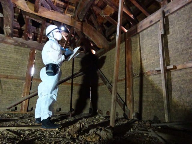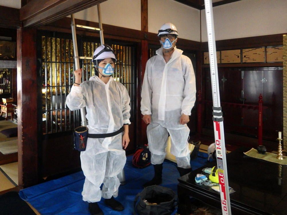 岐阜県の曹洞宗寺院から耐震診断のご相談を受けました。「うちのお寺は以前、僧堂だったそうです。禅堂らしき建物が残っているんですが・・・元の形に戻して、後世に伝えていきたいと思っています」は住職。「ただ、以前、保育園の施設として使っていたので、いろいろ改造されているんですよ」そこで、現況調査と兼ねて、改造前の姿を探る調査も行いました。当日は、大工さんに応援を頼みました。床に穴を開けてもらうと・・・フローリングの下に、杉の荒板が姿を現しました。そして、その下は三和土(たたき)です。「ということは、当初は土間で、その後畳を敷いたということですね」「なるほど、面白いなあ」興味津々の住職。その他、小屋裏に登り屋根の構造を調べ、柱の倒れを計測し、基壇の不陸を計測しました。また、柱に張ってある化粧板をはがし・・・貫や差し鴨居のほぞ穴や土壁の間渡し竹を差し込んだ穴を丁寧に調査していきました。すると・・・住職が考えもしていなかったお堂の変遷が浮かび上がりました。「元の姿といっても、どの時代に戻すのかが問題ですよね」またまた、楽しい仕事が始まりました。【菅野企画設計】は、寺院建築・和風住宅・古民家再生を得意とする設計事務所です。≫≫ 菅野企画設計 HP≫≫ 寺院完成ギャラリー≫≫ Instagram(寺院)≫≫ Instagram(住宅)≫≫ Pinterest◆本社◆ 愛知県一宮市木曽川町黒田往還南60-3 TEL 0586-84-2003◇関東事務所◇ 横浜市中区太田町6-79アブソルート横濱馬車道ビル4階 TEL 045-264-9160