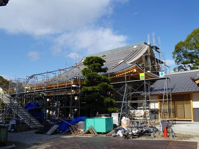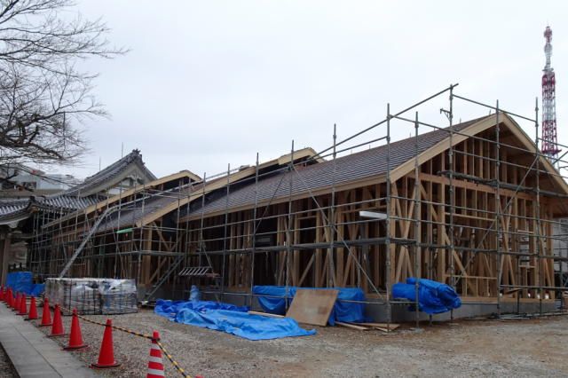 名古屋市の日蓮宗 浄昇寺客殿・庫裡新築工事が順調に進んでいます。伽藍は南棟と北棟に分かれていて、本堂とこの2棟で中庭を囲う配置です。床面積は約539平米。耐震力に優れた木造平屋建てです。現場では、先ず北棟を建て・・・現在は、南棟の建て方が進んでいます。施工は、愛知県江南市に本社を構える(株)アイチケンです。屋根は切妻の瓦葺きで、緩やかなむくりをつけます。むくりとは、上に向かってふくらんだ曲線のことです。京都の街並みで、よく見かけますよね。3つのむくり屋根が、本堂に向かってだんだん高くなっていくデザイン。「きれいにできたねえ」「大工さんが大変苦労していましたよ」は植松。ふたりで立ち話をしていると、住職ご夫婦が現場におみえになりました。「形がどんどんできてくるので、毎日が楽しみですよ」【菅野企画設計】は、寺院建築・和風住宅・古民家再生を得意とする設計事務所です。≫≫ 菅野企画設計 HP≫≫ 寺院完成ギャラリー≫≫ Instagram(寺院)≫≫ Instagram(住宅)≫≫ Pinterest◆本社◆ 愛知県一宮市木曽川町黒田往還南60-3 TEL 0586-84-2003◇関東事務所◇ 横浜市中区太田町6-79アブソルート横濱馬車道ビル4階 TEL 045-264-9160