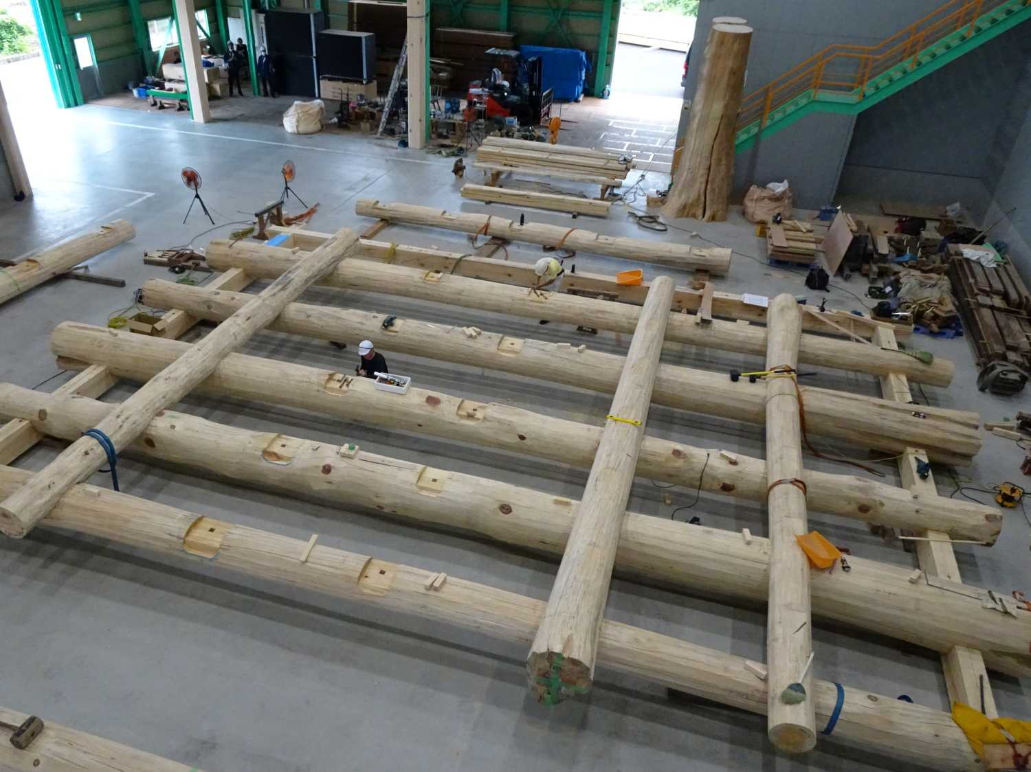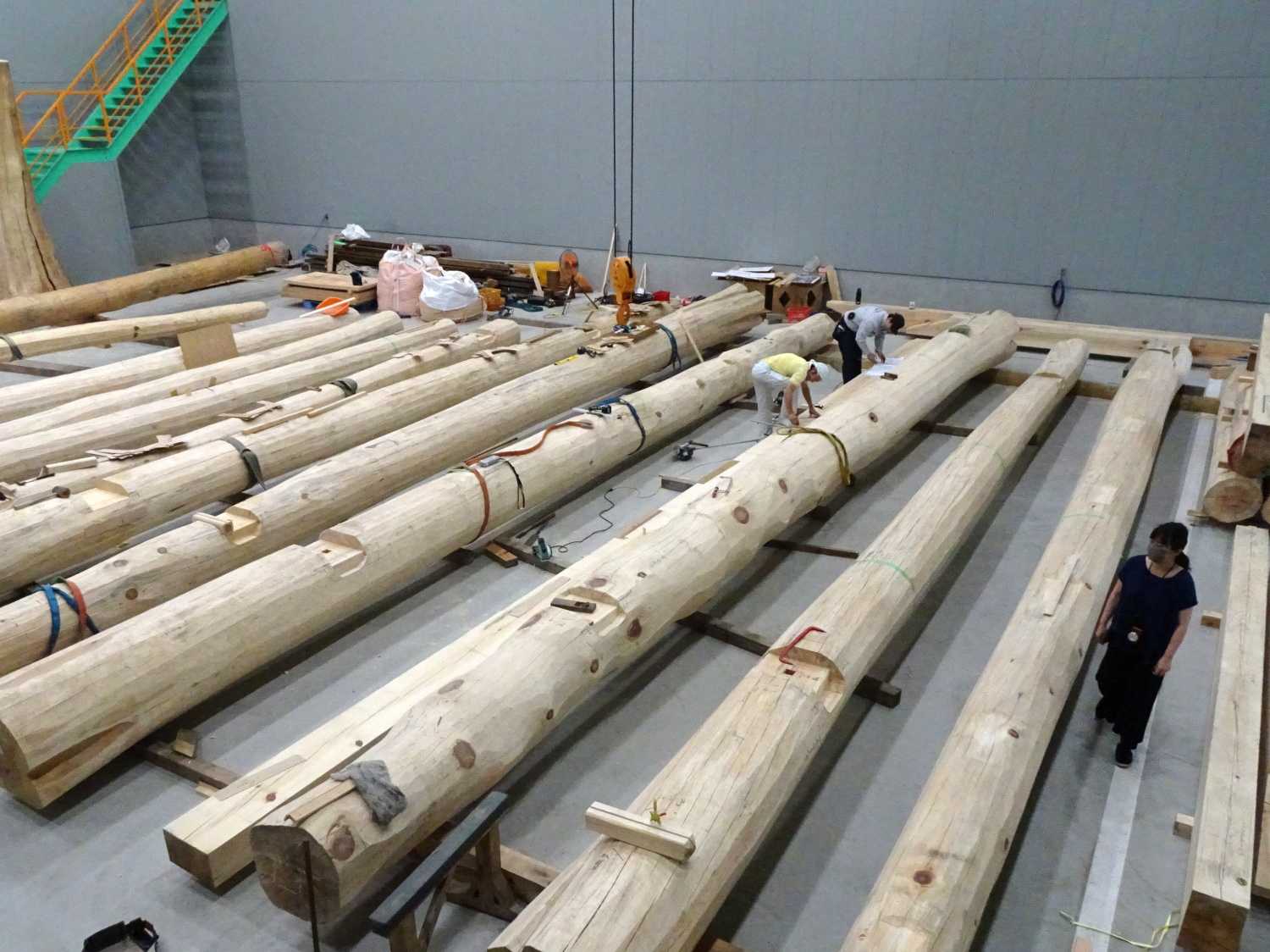 愛知県江南市の臨済宗 永正寺で本堂・位牌堂を新築します。現場では、位牌堂の造作工事と本堂の基礎工事が進んでいます。「本堂の小屋丸太の仮組みを一度見てください」工事をお願いしている株式会社 アイチケンから連絡を受け、新工場を訪ねました。新工場は作業スペースが大変広く、永正寺の最長13mの丸太がずらっと並べられます。また、ホイストがついているので、仮組みも容易です。2階から全体を見降ろすと、壮観な景色。「これはすごいねえ」加工の終わった丸太が縦横に組まれ、残った仕口を大工が仕上げています。本堂は2階建てで、天井からこの丸太が姿を現すデザイン。今から、完成が楽しみです。【菅野企画設計】は、寺院建築・和風住宅・古民家再生を得意とする設計事務所です。≫≫ 菅野企画設計 HP≫≫ 寺院完成ギャラリー≫≫ Instagram(寺院)≫≫ Instagram(住宅)≫≫ Pinterest◆本社◆ 愛知県一宮市木曽川町黒田往還南60-3 TEL 0586-84-2003◇関東事務所◇ 横浜市中区太田町6-79アブソルート横濱馬車道ビル4階 TEL 045-264-9160